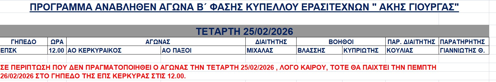 Πρόγραμμα αγώνα κυπέλλου από αναβολή 25/2 (26/2)