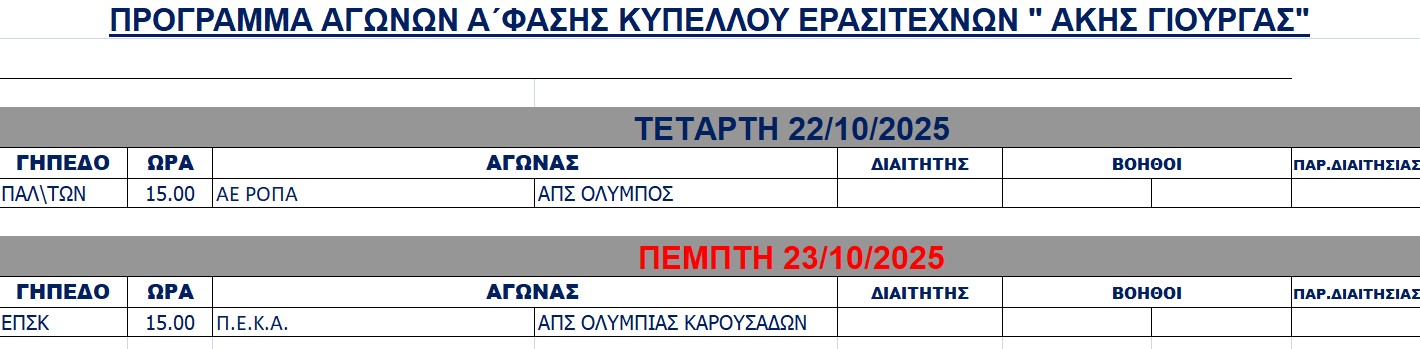 Πρόγραμμα αγώνων κυπέλλου 22-23/10/2025