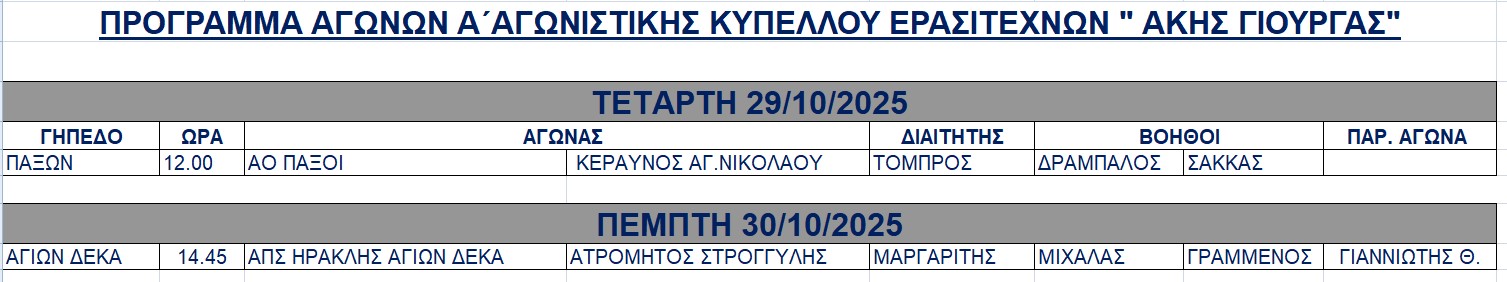 Πρόγραμμα αγώνων κυπέλλου 29-30/10/2025
