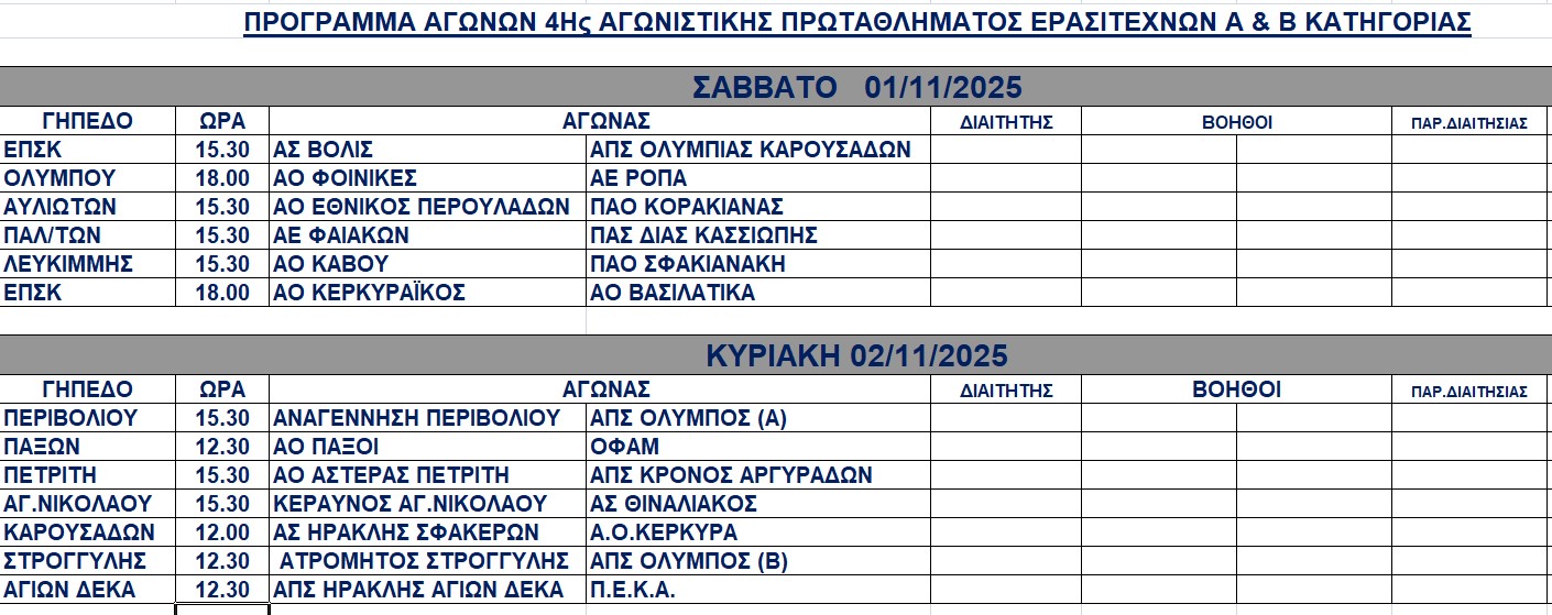 Πρόγραμμα αγώνων Σαββατοκύριακου 1-2/11/2025