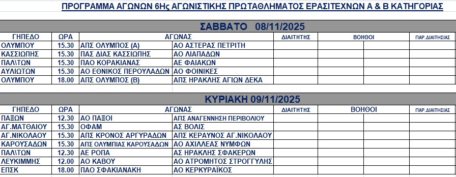 Πρόγραμμα ανδρικών αγώνων Σαββατοκύριακου 8-9/11/2025