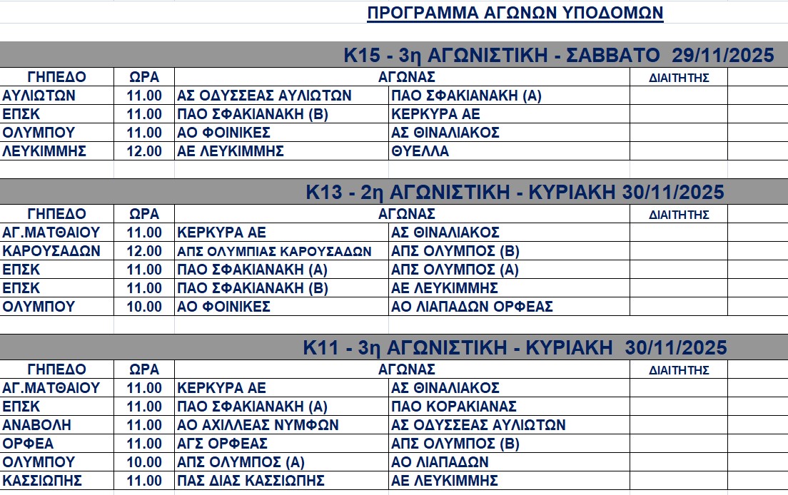 Πρόγραμμα αγώνων υποδομών 29-30/11/2025