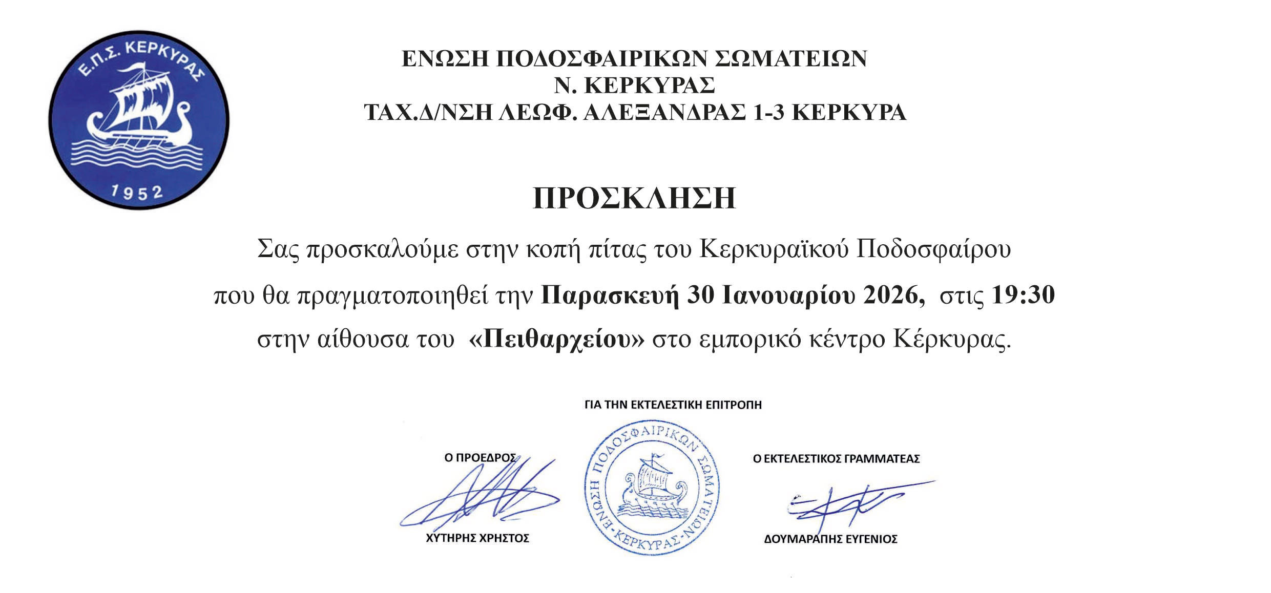 Πρόσκληση κοπής πίτας ΕΠΣ Κέρκυρας