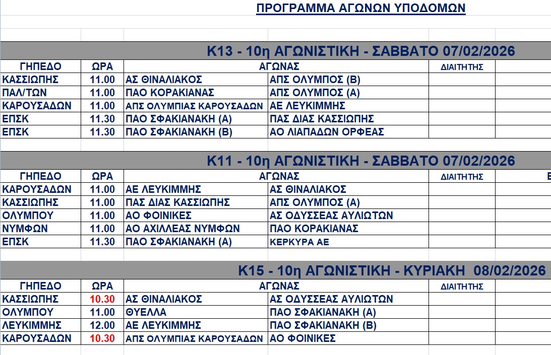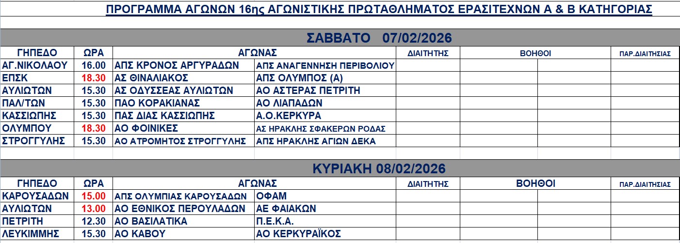 Πρόγραμμα αγώνων 7-8/2/2026 (ορθή επανάληψη)