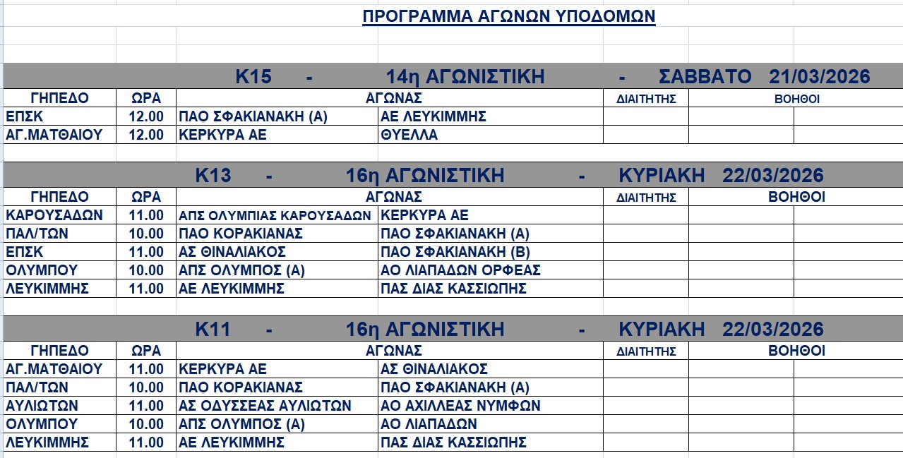 Πρόγραμμα αγώνων 21-22/3/2026