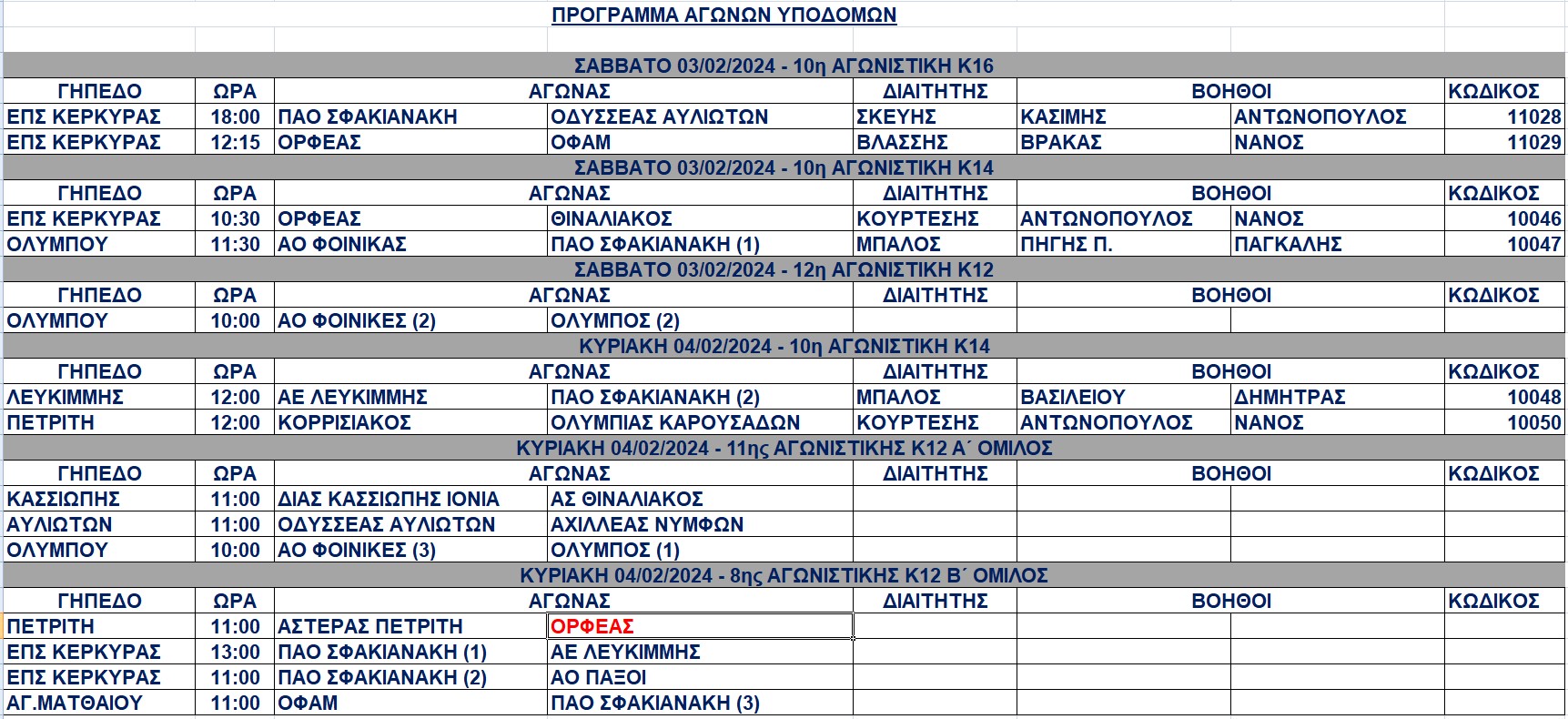 Πρόγραμμα αγώνων υποδομών 3-4/2/2024