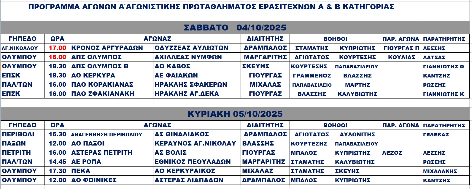Διαιτητές και παρατηρητές αγώνων 4-5/10/2025