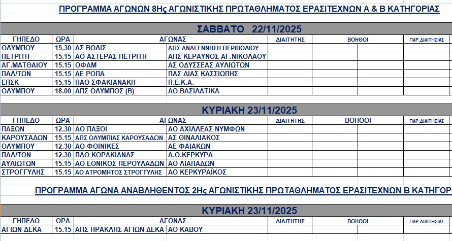 Πρόγραμμα ανδρικών αγώνων 22-23/11/2025