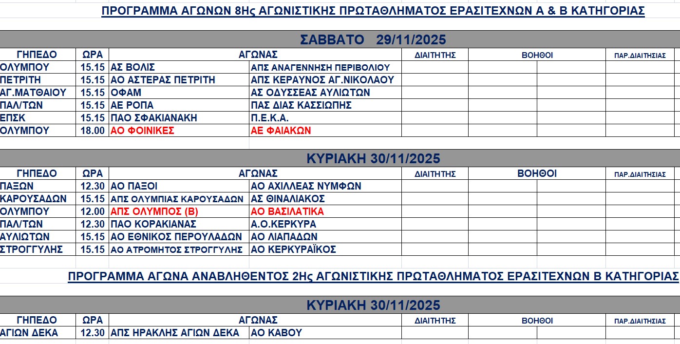 Πρόγραμμα ανδρικών αγώνων 29-30/11/2025