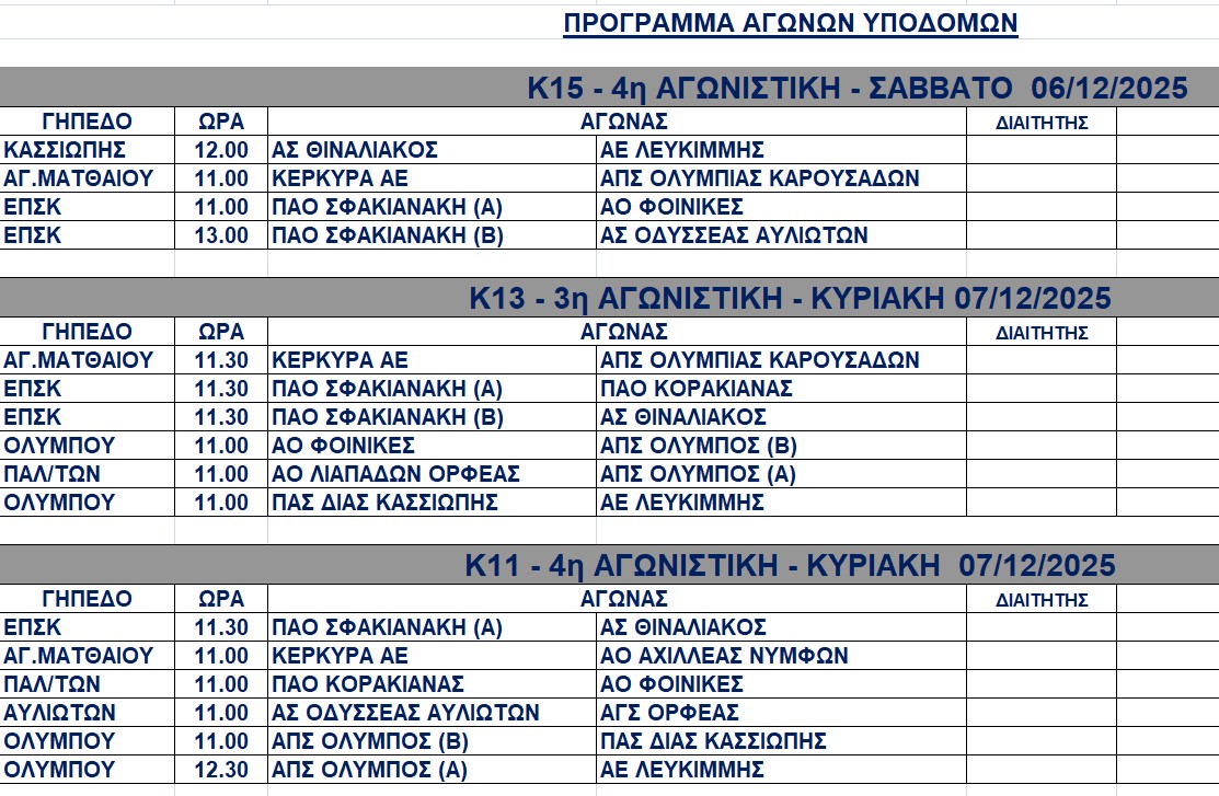 Πρόγραμμα αγώνων υποδομών 6-7/12/2025