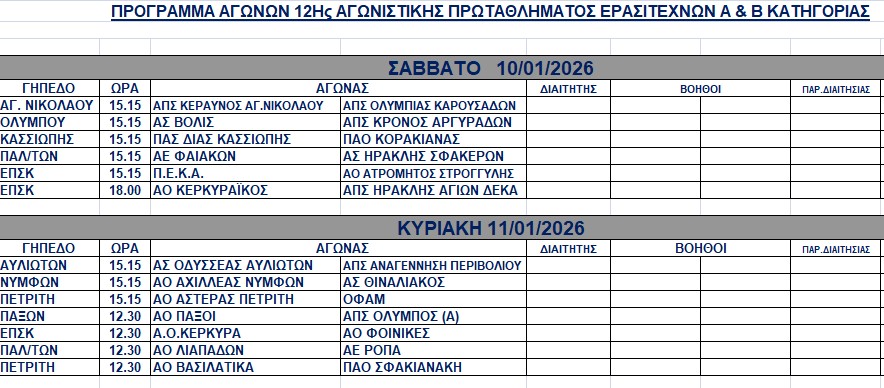 Πρόγραμμα ανδρικών αγώνων 10-11/1/2026