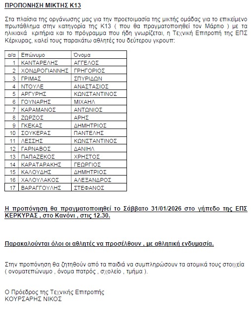 Πρόσκληση προπόνησης μικτής ομάδας Κ13 (31/1)