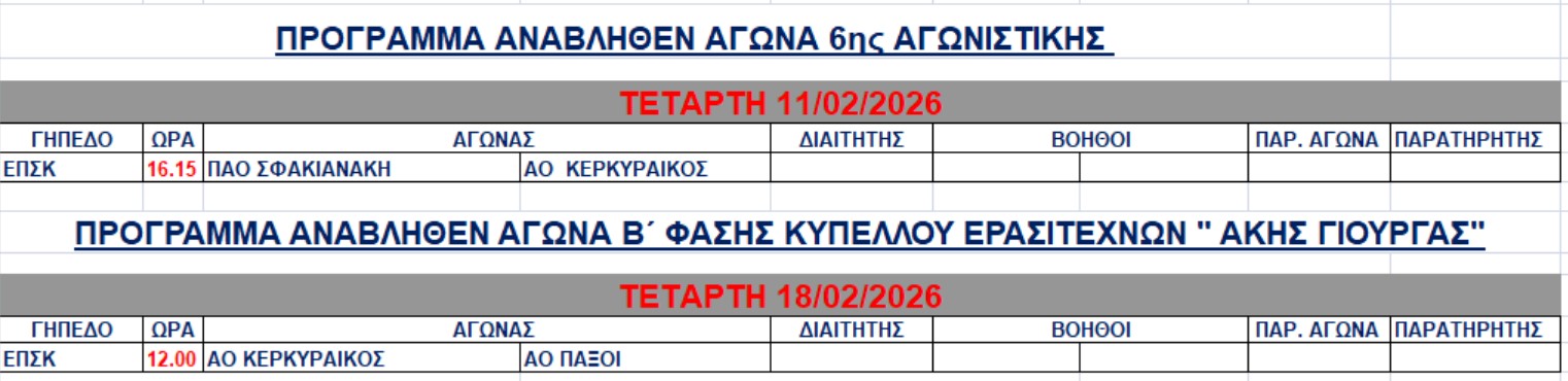 Πρόγραμμα αγώνων από αναβολή 11 και 18/2/2026 (ορθή επανάληψη)
