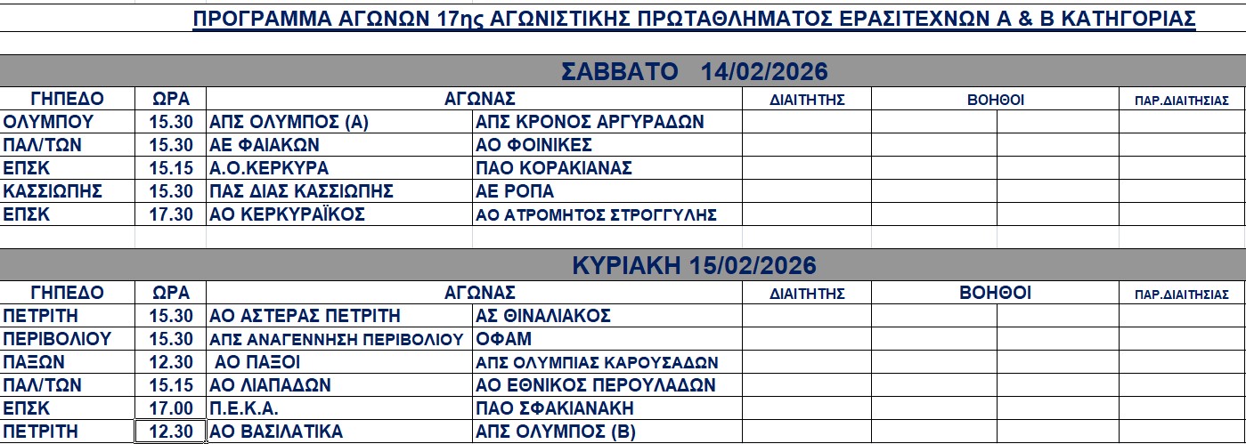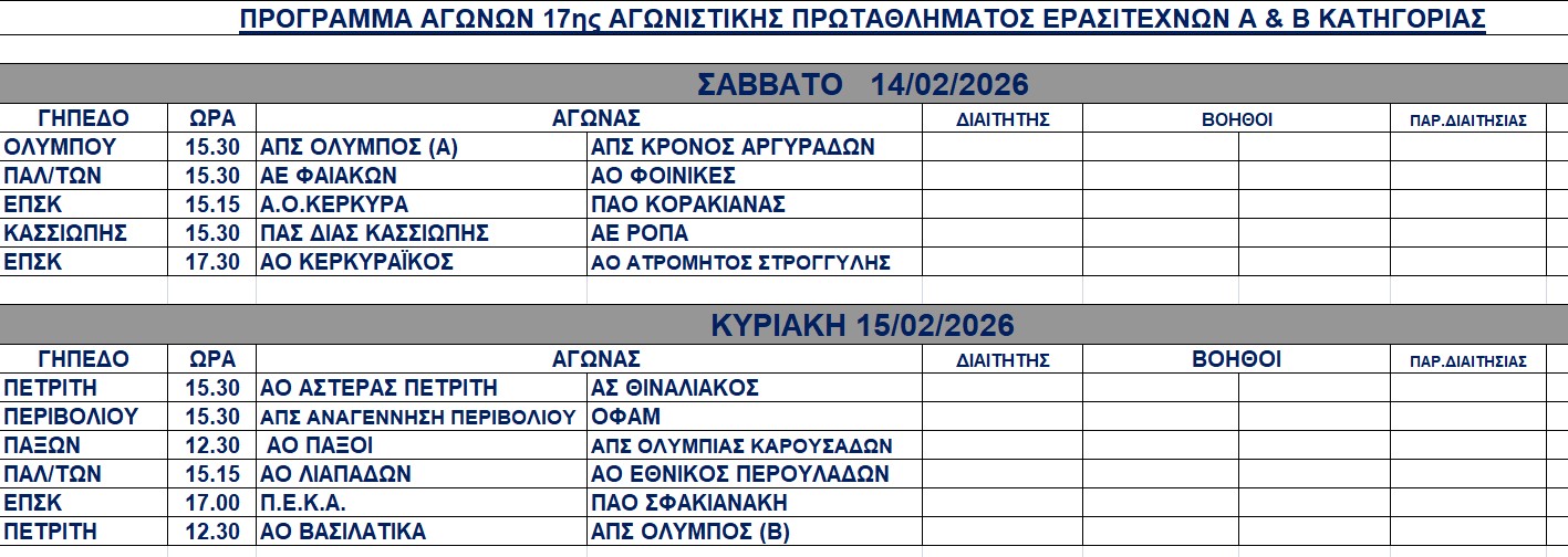 Πρόγραμμα αγώνων 14-15/2/2026