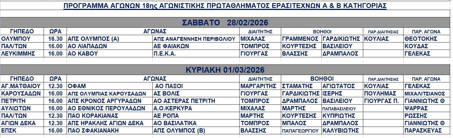 Πρόγραμμα αγώνων 7-8/2/2026 (ορθή επανάληψη)